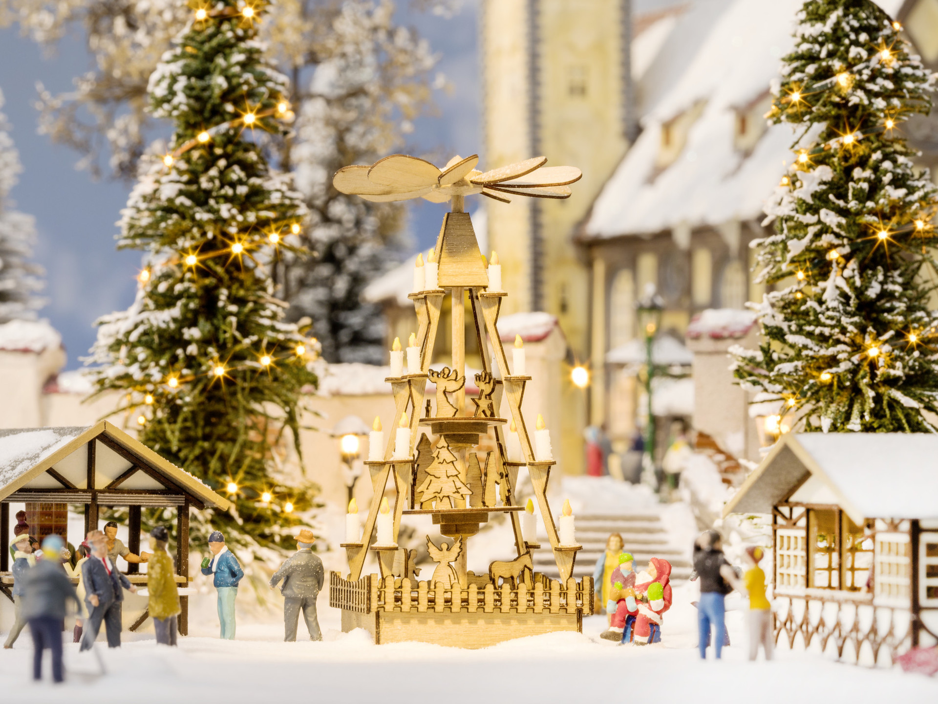 Die NOCH „Weihnachtsmarkt-Pyramide“ darf auf keiner winterlichen Modelllandschaftsszene fehlen, die einen realistischen Weihnachtsmarkt darstellen soll. Die Menschen gehen am liebsten in der Adventszeit mit ihren Liebsten auf den Weihnachtsmarkt. Neben verschiedenen Marktständen mit Leckerein und Geschenken darf neben der Weihnachtskirppe die „Weihnachtsmarkt-Pyramide“ nicht fehlen. Sie ist meistens aus Holz filigran geschnitzt und dreht sich langsam zu besinnlicher Adventsmusik. Die dargestellten Engel tanzen zur Musik und die leuchtenden Lichter erhellen den verschneiten Weihnachtsmarkt. Hier ist besinnliche Stimmung garantiert. Die Menschen genießen die Vorweihnachtszeit und freuen sich auf Heilig Abend. Bringen Sie diese tolle winterliche Szene mit auf Ihre Landschaft und verzaubern Sie diese mit liebevollen Details.