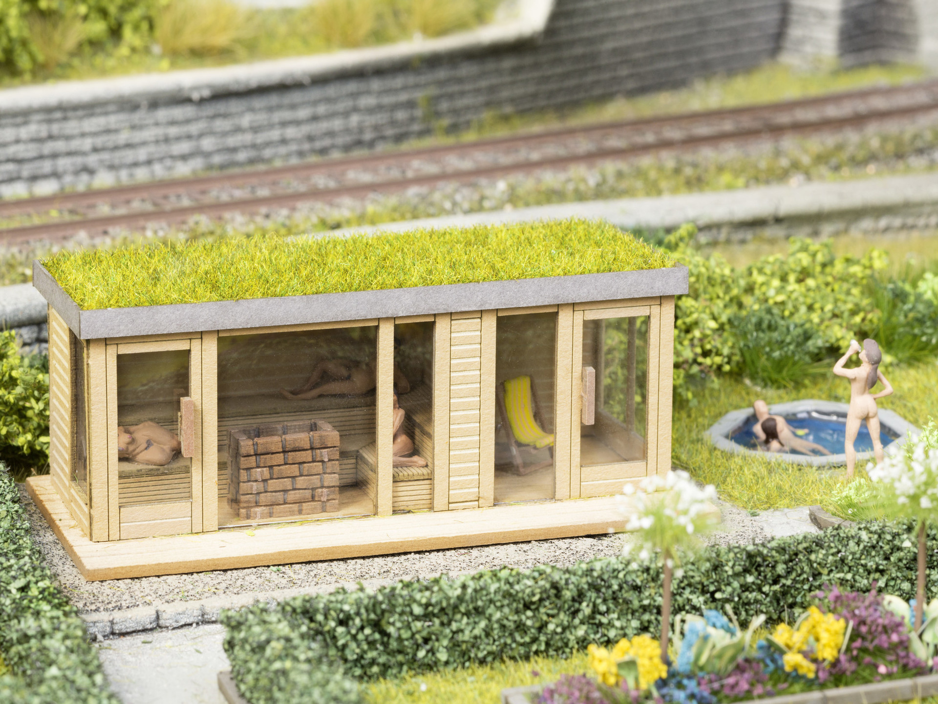 Die NOCH „Sauna mit Ausblick“ eignet sich ideal als hochwertige Ausgestaltung für jede Modelllandschaft. Viele Menschen gehen in die Sauna, um so richtig vom Alltagsstress abschalten zu können. Wenn man dann auch noch eine eigene Saune im Garten stehen hat und jederzeit in die Saune kann ist das natürlich toll. Das Gebäude besteht aus einem Ruheraum und der eigentlichen Saune mit dem typischen Ofen. Es gibt jedoch separate Eingänge. Es können verschiedne Aufgüsse, wie zum Beispiel Aroma-Aufguss, Honig- oder Salz-Aufgüsse gemacht werden. Das Schwitzbad in der Sauna fördert die Gesundheit und dient der Entspannung. Hier lässt es sich aushalten und gemeinsam mit Freunden oder dem Partner kann man hier in vollen Zügen abschalten. Bringen Sie diese entspannte und idyllische Szene mit auf Ihre Modellanlage und setzen Sie diese so noch mehr in Szene.