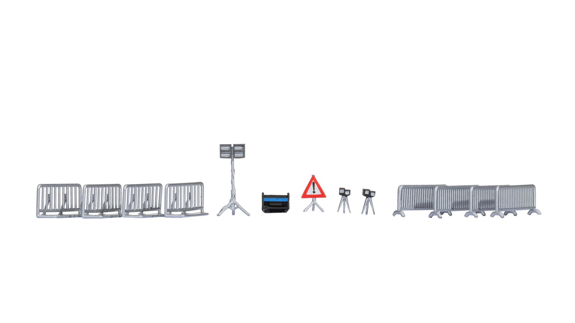 NOCH 14821 – Polizei-Zubehör Inhalt: 4 leichte Absperrgitter 4 Hamburger Gitter 1 Flutlichtstrahler 1 Strom-Aggregat 2 Blitzer 1 Verkehrsschild