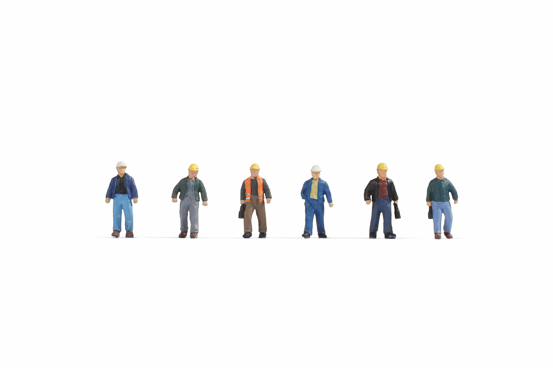 Das Set umfasst sechs stehende und gehende Modellfiguren in der Spurweite H0 (Maßstab 1:87). Die Bauarbeiter tragen typische Arbeitskleidung wie Blaumann oder Sicherheitsweste und haben weiße und gelbe Helme auf dem Kopf.