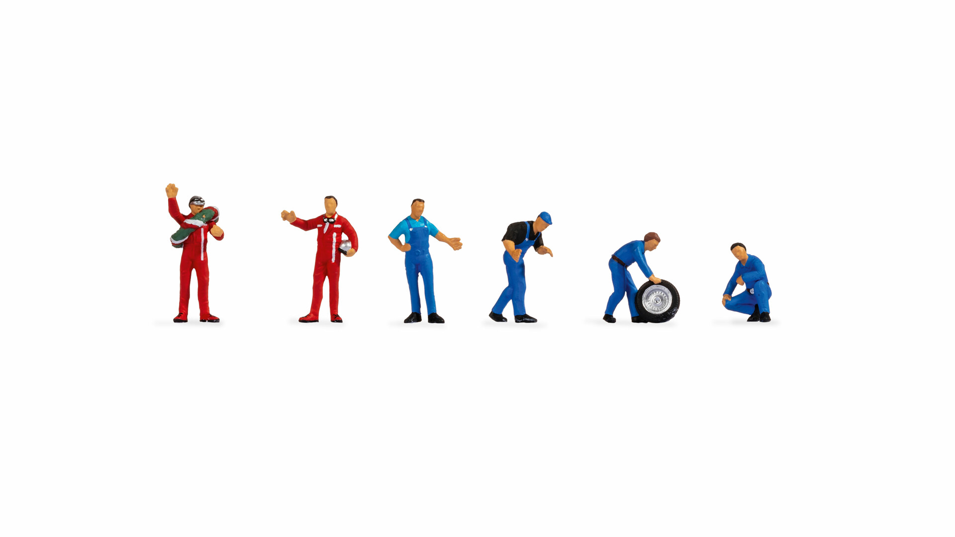 4 Mechanikerfiguren kümmern sich um die Rennautos. Sie tragen alle blaue Overalls oder Latzhosen. Während eine Figur gerade ein loses Rad wegrollt, hat sich ein anderer Mechaniker daran gemacht, die Radschrauben des Rennwagens wieder anzuschrauben. Ein weiterer Mechaniker beugt sich über das Auto, um es zu begutachten. Der vierte Mechaniker steht aufrecht da und betrachtet mit der Hand in die Hüfte gestellt sein Werk.