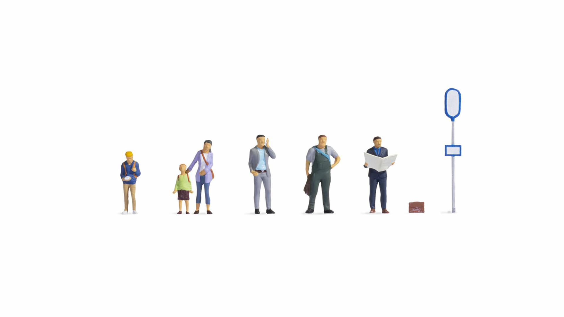 Im Figuren-Set in der Spurweite H0 sind sechs Figuren, ein Gepäckstück sowie ein Haltestellenschild enthalten. Der Mann im Mantel hat seinen Aktenkoffer neben sich abgestellt und vertreibt sich die Wartezeit mit Zeitung lesen. Diese hält er aufgeschlagen in den Händen. Ein Mann in Latzhose und T-Shirt hält seine Jacke in der Hand und stützt die andere in der Hüfte ab. Ein weiterer Mann trägt ein Jackett und hält sein Handy zum Telefonieren an sein Ohr. Außerdem befindet sich eine Mutter im Set, die eine Tasche umgehängt hat und eine Hand nach ihrem Sohn ausstreckt. Dieser steht mit einem Schulranzen auf dem Rücken neben ihr und hat kurze Hosen sowie ein langärmliges Shirt an. Ein junger Mann wartet ebenfalls auf den Bus und schaut dabei auf sein Handy.