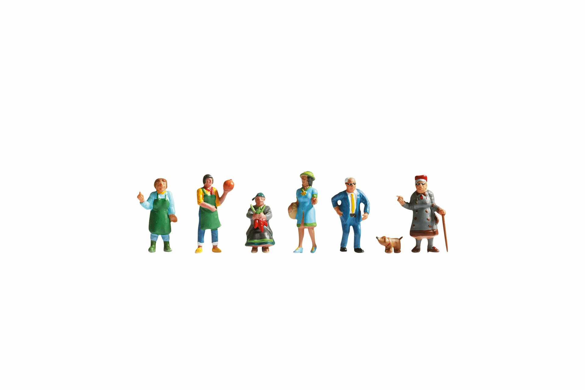 Das Set enthält sechs Modellfiguren und einen Hund. Drei der Figuren stellen Verkäufer dar, wie sie auf typischen Marktstand zu finden sind. Eine junge Verkäuferin hält einen Kürbis hoch, eine ältere, sitzende Verkäuferin hält Rüben in den Händen, die dritte Verkäuferin unterhält sich mit einem Kunden. Drei weitere Modellfiguren stellen Kunden dar. Eine elegante Dame mit einem Korb im Arm wählt Gemüse aus. Ein älterer Herr im blauen Anzug greift nach seiner Brieftasche und eine alte Dame mit ihrem kleinen Dackel ist im angeregten Gespräch mit einer Verkäuferin.