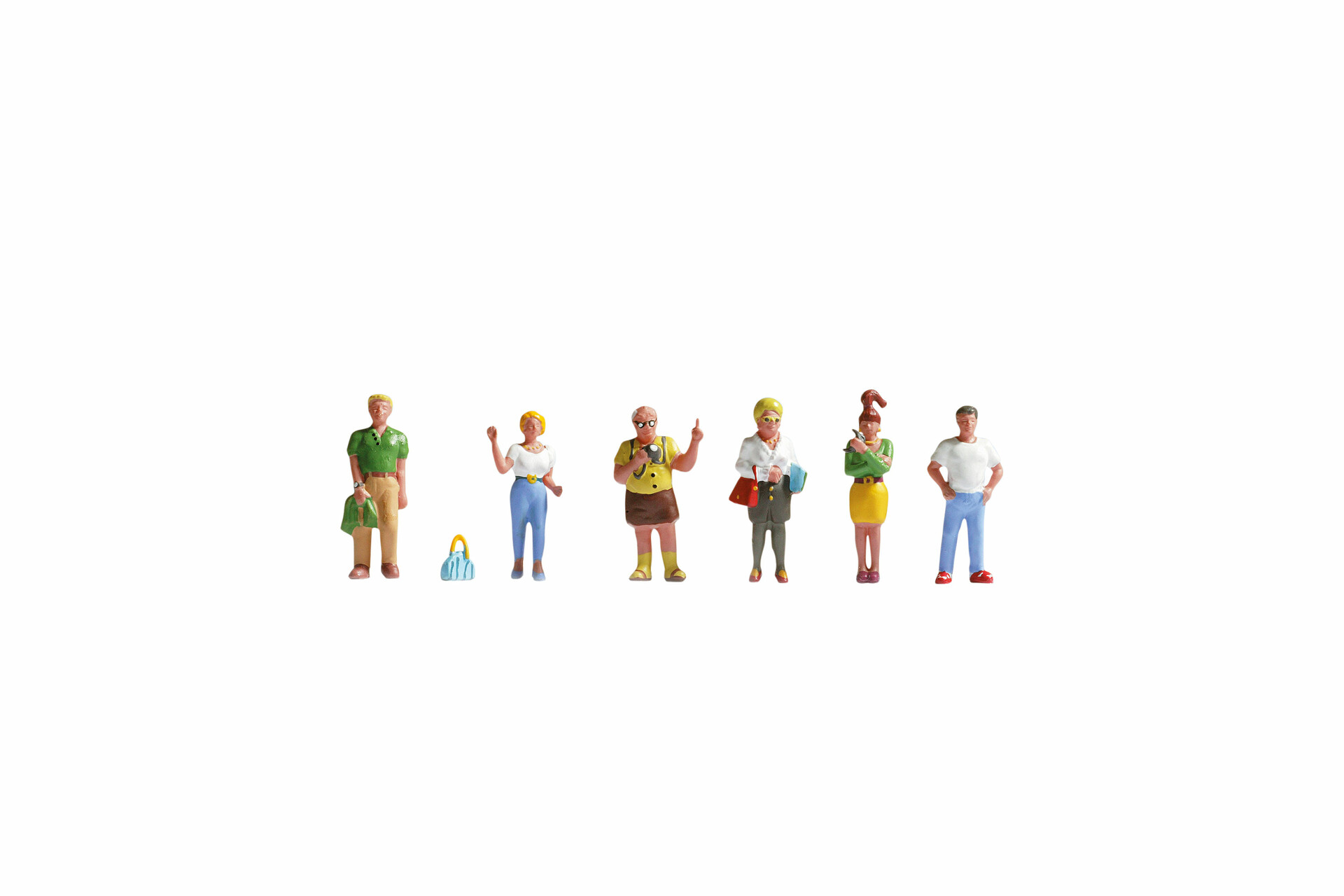 Ein junger Mann in beigefarbener Hose und grünem T-Shirt und eine junge Frau in Jeans und weißem T-Shirt stehen wartend. Ein älterer Herr in kurzer Hose und gelbem Hemd macht ein Foto. Eine gut gekleidete ältere Dame mit Rock und Bluse kommt offenbar vom Shoppen. Eine junge Frau mit Minirock und Pferdeschwanz und ein junger Mann in Jeans stehen wartend. Das Figurenset ist ideal geeignet um Stadt- oder Dorfszenen auf Modelleinbahnanlagen zu dekorieren. Die Modellfiguren sind insbesondere für die Gestaltung von Bahnsteigen und Bushaltestellen geeignet.