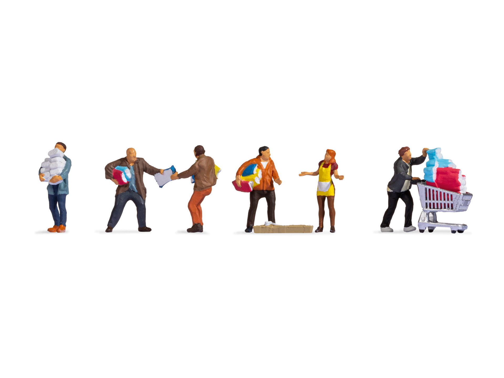 Das Figuren-Set „Menschen beim Hamsterkauf“ beinhaltet 6 Figuren. 1 Figur schiebt einen vollbeladenen Einkaufswagen mit Klopapier. 2 Personen streiten sich um einen bestimmten Artikel. Eine weitere Person hält eine große Menge des Einkaufs in der Hand. Eine Verkäuferin mit einer gelb-weißen Schürze diskutiert mit einem Kunden.