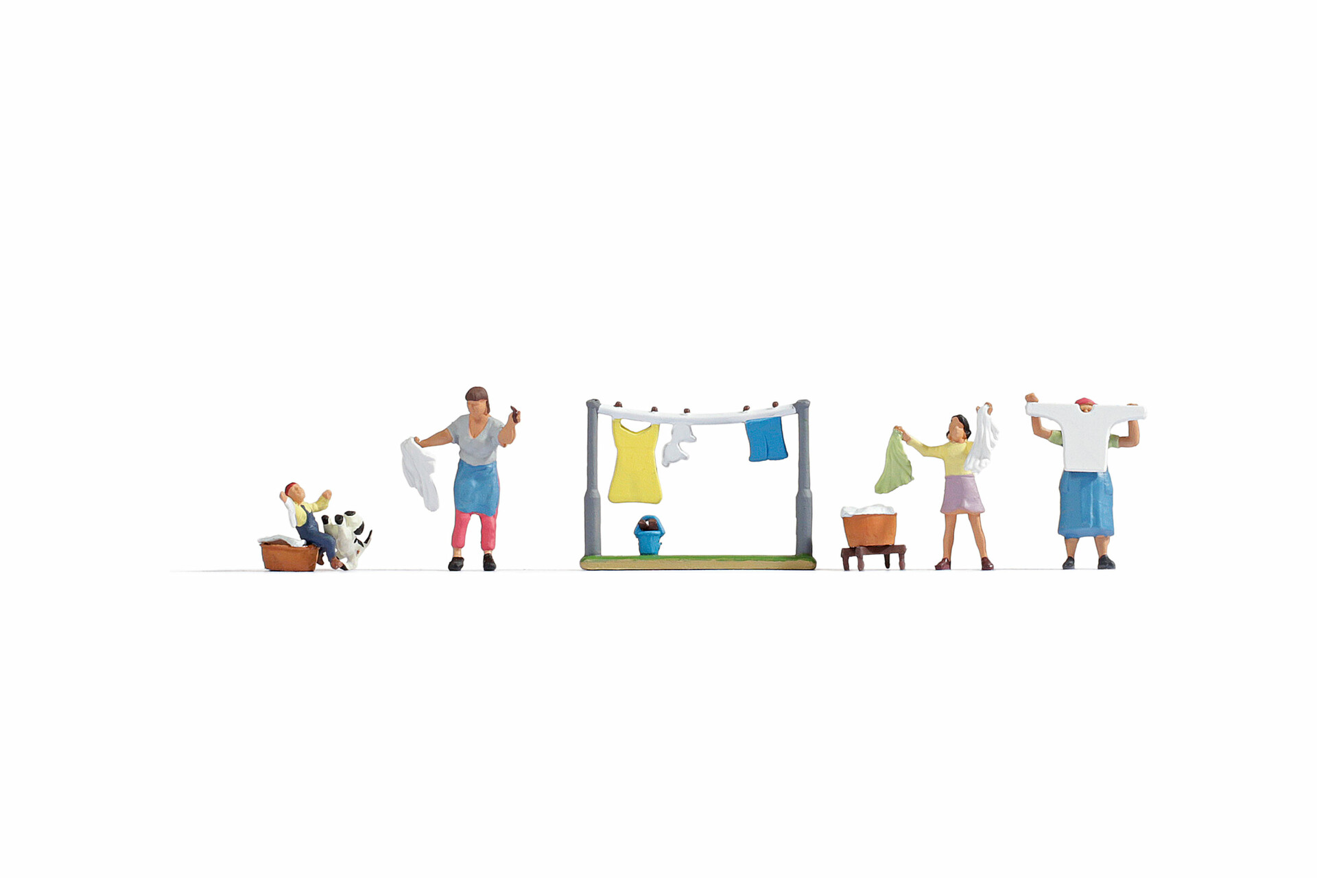 Das Set für die Spur H0 (Maßstab 1:87, ca. 2 cm hoch) enthält drei Frauen beim Waschtag, ein Kind, ein schwarz-weißer Hund, eine Wäscheleine mit aufgehängter Wäsche sowie zwei braune Wäschekörbe von denen einer auf einem dunkelbraunen Hocker steht.