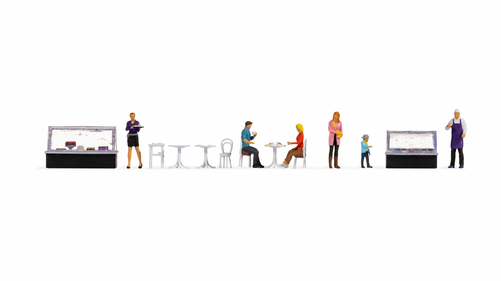 Mit der Figuren-Themenwelt „Café“ holen Sie sich das entspannte Flair eines lebhaften Straßencafés direkt auf Ihre Modellbahnanlage. Gäste plaudern bei einem duftenden Kaffee, ein Eisverkäufer reicht bunte Kugeln über die Theke, und eine freundliche Servicekraft kümmert sich um das Wohl der Besucher – eine Szene voller Leben und Genuss.