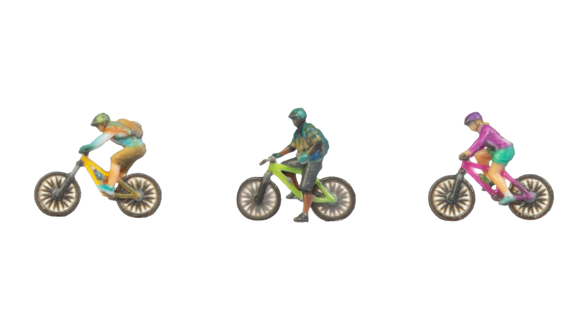Mountainbiker – Natur, Tempo und sportliche Action im Gelände Mit den NOCH „Mountainbiker“ holen Sie sich eine Szene auf Ihre Modellanlage, die sofort nach Waldweg, Schotterpiste und sportlicher Freiheit aussieht. Hier wird angetreten, balanciert, gelenkt und Strecke gemacht – mitten durchs Gelände, konzentriert und in Bewegung. Genau diese Momente, in denen man den Fahrtwind förmlich spürt, bringen Dynamik in Ihre Modellwelt. Es sind Szenen aus dem echten Leben, die man sofort erkennt: Menschen, die draußen unterwegs sind und ihre Route genießen. Die Figuren sind sorgfältig bemalt und detailreich ausgearbeitet. Unterschiedliche Haltungen und die typische Sitzposition auf dem Bike sorgen für Abwechslung und eine stimmige Gesamtwirkung. So werden Wege, Pfade und Übergänge in Ihrer Landschaft nicht nur Kulisse, sondern wirken wie echte Strecken, auf denen etwas passiert. NOCH bildet die Realität authentisch ab und macht aus kleinen Details eine Szene mit spürbarer Bewegung. Ob auf einem Waldpfad, entlang eines Feldwegs, am Rand eines Dorfes oder als sportlicher Akzent im Umfeld von Bahnhof und Ausflugsroute: Die Mountainbiker lockern Ihre Anlage auf und setzen lebendige Punkte im Gelände. Gleichzeitig sind sie vielseitig einsetzbar – im klassischen Modellbau und auf der Modelleisenbahn genauso wie für Dekoration, DIY-Projekte oder Makrofotografie, wenn Sie dynamische Miniaturmomente gestalten und festhalten möchten. So entsteht aus einem Wegstück ein Stück Outdoor-Geschichte im Kleinen.
