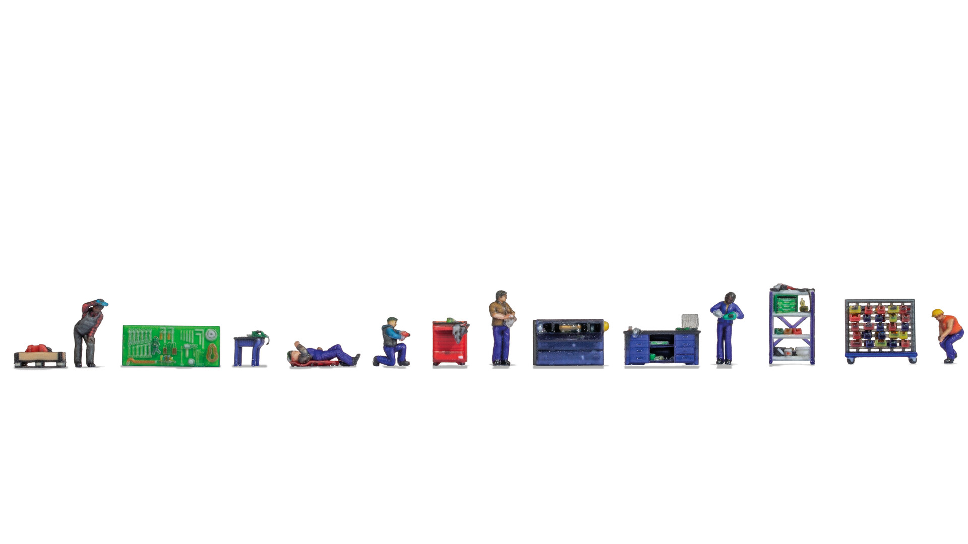 NOCH 35902 – Figuren-Themenwelt „Werkstatt“ Inhalt: 6 Figuren, 1 Stapelplatte mit Werkzeug, 1 Werkzeugwand, 1 Arbeitstisch, 1 Schreibtisch, 1 Regal, 1 Sortierregal, 1 Werkzeugwagen, 1 Spint