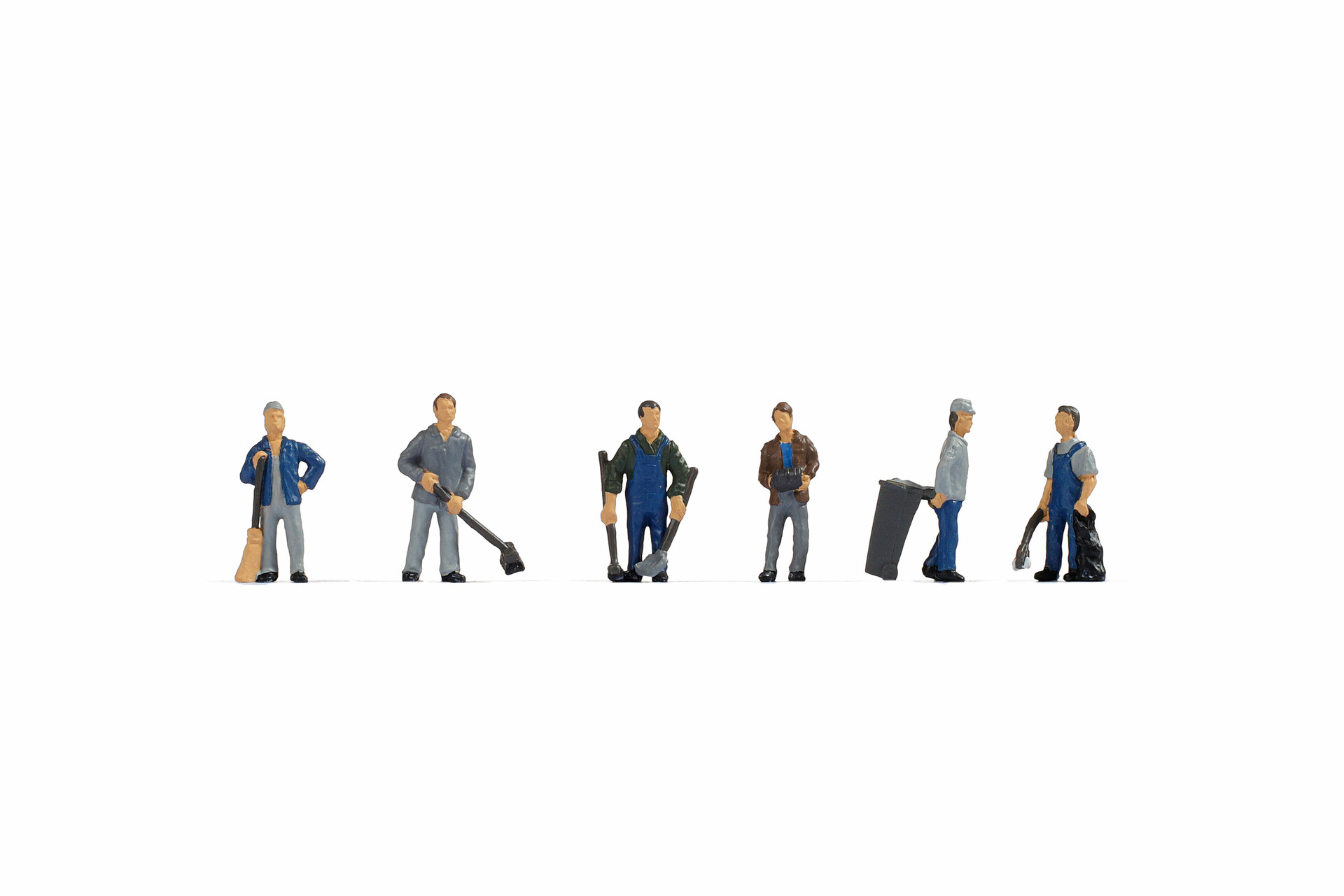 Das Set enthält sechs handbemalte Modellfiguren aus Kunststoff. Die Figuren tragen die für Hausmeister typische Arbeitskleidung und führen verschiedene Tätigkeiten aus. Ein Arbeiter sammelt den Müll auf, ein weiterer zieht eine Mülltonne, weitere Hausmeister hantieren mit Schaufel und Besen.