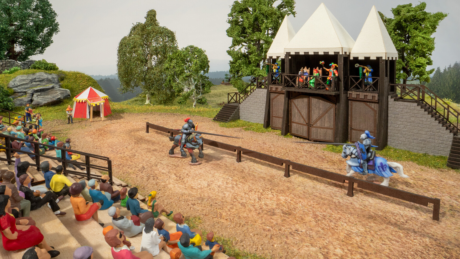 NOCH 66828 – micro-motion Ritterturnier mit micro-sound Inhalt: Laser-Cut Bausätze Turnierplatz, Tor mit Loge, Tribüne und 4 Zelten 9 exklusive, farbig gedruckte Figuren, 2 davon zu Pferd für den Einsatz a…