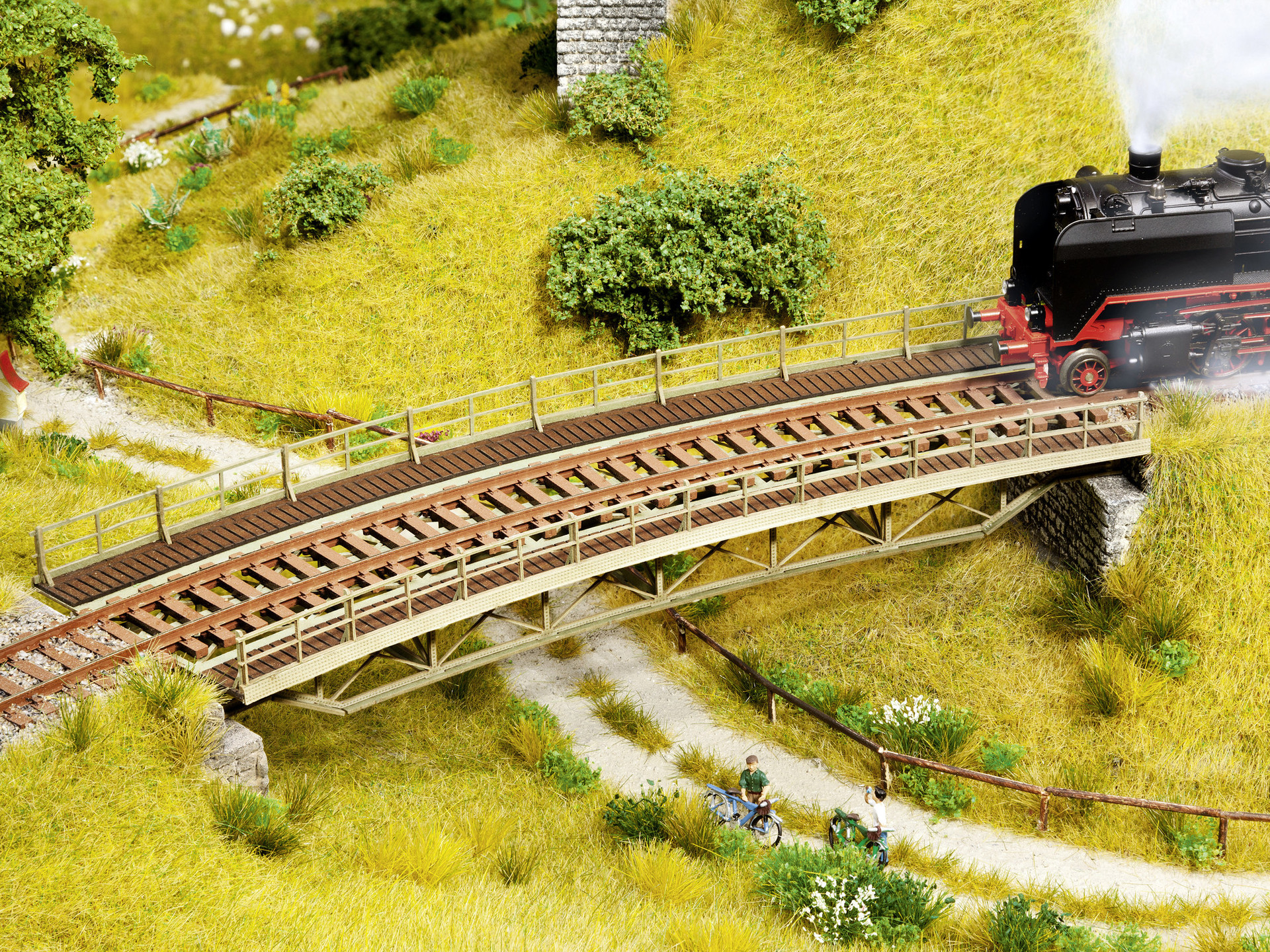 Brücken von NOCH steigern die Attraktivität jeder Modellbahnanlage. Sie sind zudem vielseitig einsetzbar, zum Beispiel zum Überwinden von Steigungen, Flüssen und Tälern. Die „Brückenfahrbahn, gebogen“ eignet sich ideal, um wirklichkeitsgetreue Szenen in jedem Diorama noch perfekter auszugestalten. Über die Brücke bahnt sich der Modellzug seinen Weg. Um sicher und schnell Täler, Schluchten, Gewässer und andere Naturgegebenheiten zu überqueren eignet sich die „Brückenfahrbahn, gebogen“ ideal dafür.NOCH Laser-Cut Brücken sind nicht nur schön, sondern auch stabil. Die Statik der filigranen Laser-Teile folgt dabei denselben Gesetzen wie bei den großen Vorbildern. Dadurch entstehen kleine Stahlbau-Kunstwerke, die hervorragend für den Einsatz in Ihrer Modell-Landschaft geeignet sind.
