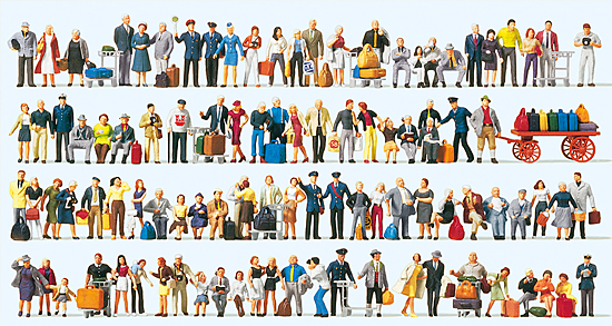 Preiser 13000 – H0 Bahnpersonal, Reisende, Passanten. 100 exklusiv bemalte Miniaturfiguren.Zubehör