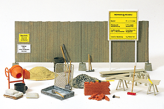 Preiser 17177 – H0 Betonmischer, Bauzaun, Werkzeug etc. Bausatz