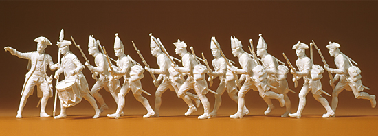Preiser 63851 – 1:32 Preußen 1756. Offizier und Mannschaft, stürmend. 11 unbemalte Figuren. Bausatz